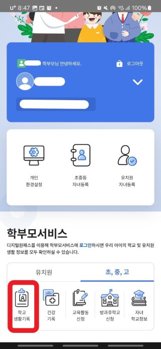 - 로그인 후 ‘학생 서비스’ 또는 ‘학부모 서비스’ 선택