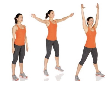 - 팔 벌려 뛰기 (로우 임팩트): 팔만 움직이거나 발을 번갈아 가며 살짝 탭 - 심박수 서서히 증가