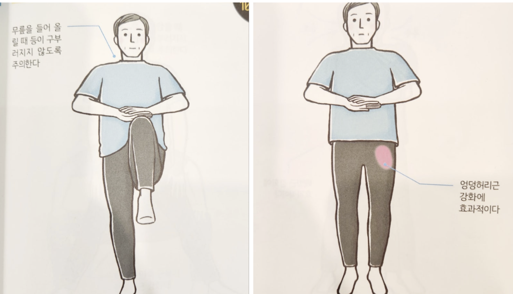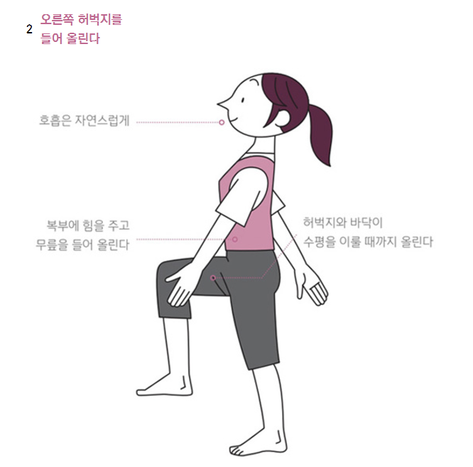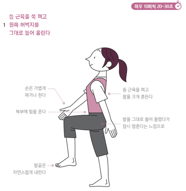 - 무릎 들어 올리기: 제자리에서 무릎을 번갈아 가며 가슴 높이까지 올리기 (각 다리 5회) - 고관절 유연성 향상