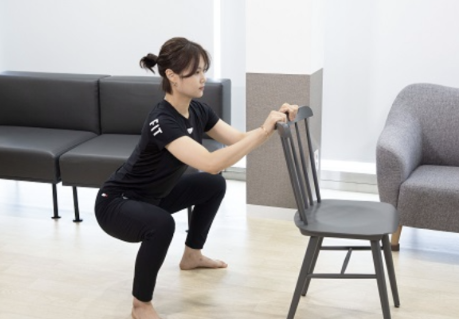 - 스쿼트 (의자 잡고): 8회 2세트, 각 세트 사이 60초 휴식 - 허벅지, 엉덩이 근육 인지 및 활성화. 팁: 의자에 앉는다는 느낌으로 천천히 내려가고, 무릎이 발끝을 넘지 않도록 주의.