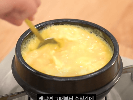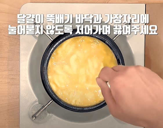 달걀이 뚝배기의 바닥과 가장자리에 눌어붙지 않도록 뒤집어 주듯 저어가며 끓여줍니다.