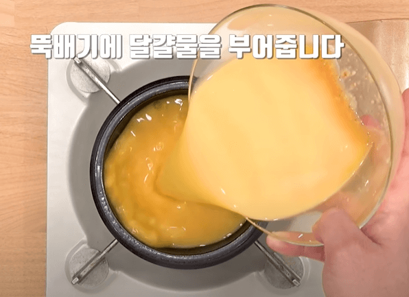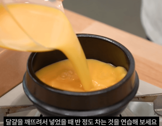 뚝배기에 달걀물을 부어주고 뚝배기에 반 정도의 양을 맞춰줍니다.