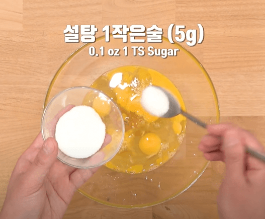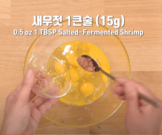 새우젓 1큰술을 넣고 설탕 1작은술을 넣어주고 재료들이 잘 섞일 수 있도록 저어줍니다. 여기서 설탕이 들어가야 계란찜의 맛을 더욱 풍미 있게 느낄 수 있어 설탕은 꼭 넣어주시길 바랍니다.