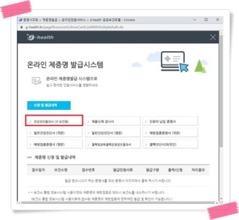 - ‘제증명 발급’ 메뉴 선택 → ‘건강진단결과서(보건증)’ 클릭