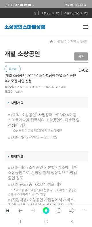 - "2025년 스마트 상점 기술보급 사업 참여 소상공인 모집" 공고를 확인하고 "신청하기" 버튼을 클릭합니다.