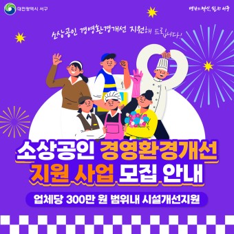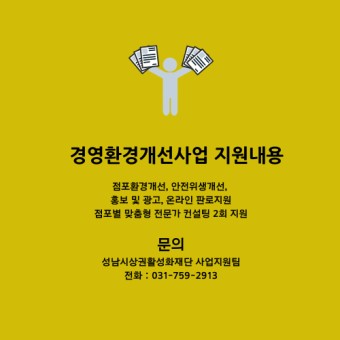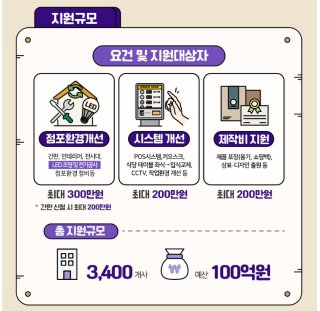 | 점포 환경 개선 | 간판 교체, 제품 진열대 설치, 인테리어 도배, 조명, 샤시, 닥트 등 |