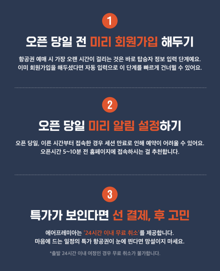 - 선 결제, 후 고민도 좋아요: 에어프레미아는 24시간 이내 무료 취소가 가능합니다. 마음에 드는 일정의 특가 항공권이 있다면 망설이지 말고 먼저 결제하는 것도 방법입니다.