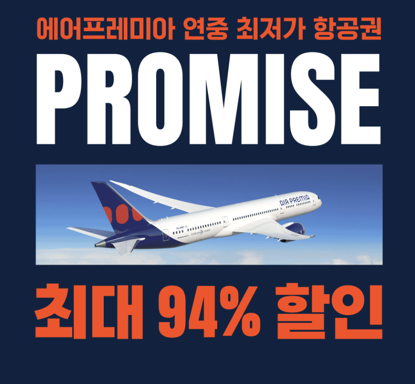 에어프레미아가 2025년 상반기 최대 할인 이벤트인 '프로미스' 프로모션을 진행합니다! 연중 최대 규모의 할인 행사로, 연중 단 두 번만 열리는 초특가 프로모션입니다.