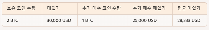 예를 들어, 비트코인 2개를 각각 30,000 USD에 매수한 후, 코인 가격이 하락하여 추가로 1개를 25,000 USD에 매수했다고 가정해보겠습니다.