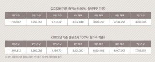 | 기준 중위소득 60% | 1,337,067원 | 2,209,565원 | 2,828,794원 | 3,437,948원 | 4,017,441원 |