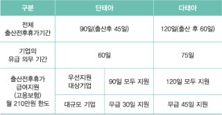 - 출산휴가 기간: 90일 (다태아 120일), 출산 후 45일(다태아 60일) 의무 사용입니다.