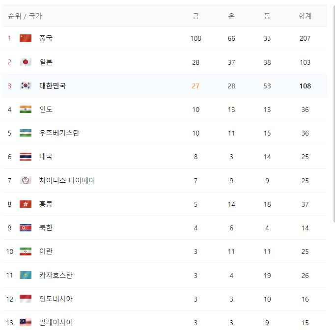 항저우 아시안게임 종합 순위 및 메달 현황