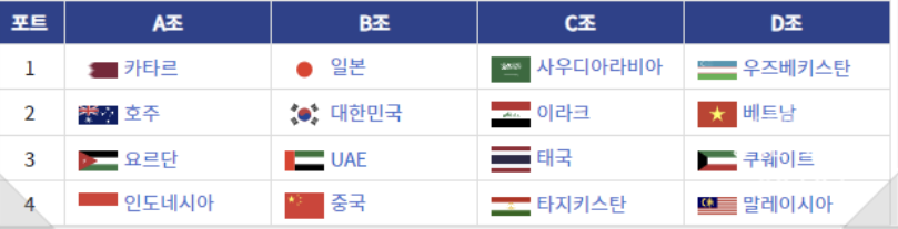 위 네 그룹에서 준중계에서 8강에 진출한 팀들입니다. 예상대로, 일본, 사우디 아라비아, 그리고 우즈베키스탄이 부상했다는 것을 확인할 수 있습니다.