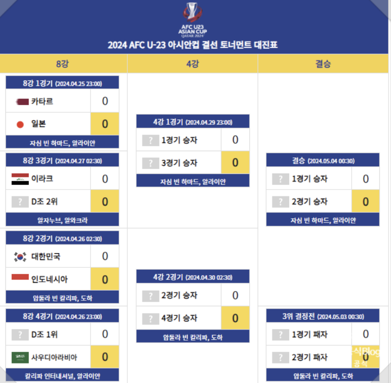 두 번째 준결승 경기는 4월 30일 화요일 새벽 2시 30분에 열릴 예정입니다. 카타르 대 일본의 승자와 이라크 대 그룹 D 준우승팀의 승자 사이에 경기가 있을 것입니다.
