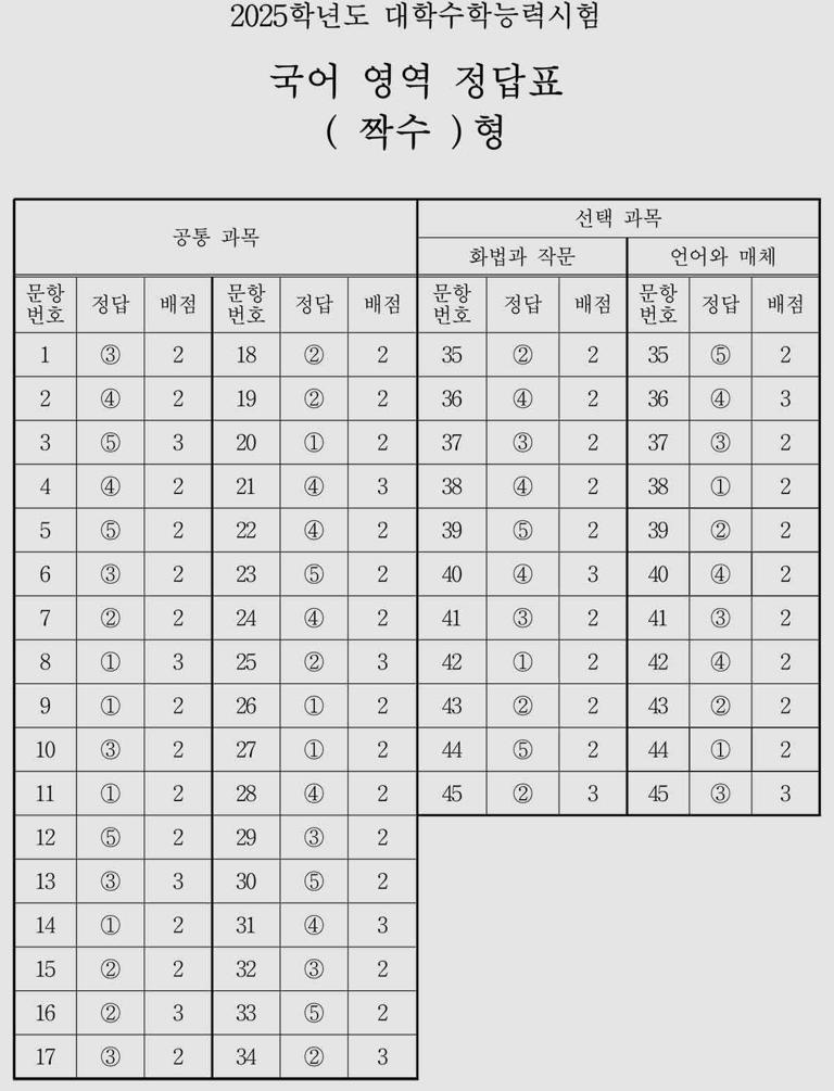 국어 영역은 수능의 첫 번째 과목으로, 독해와 문법, 작문 등 다양한 분야에서 문제가 출제됩니다. 2025학년도 국어 영역의 정답은 다음과 같습니다.