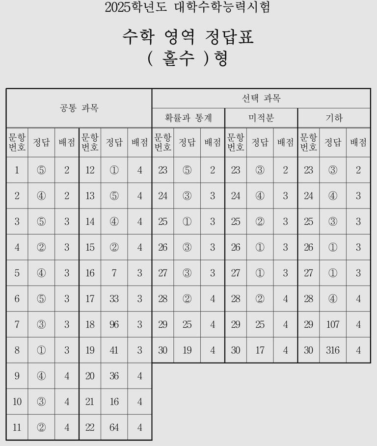 수학 영역은 수학적 사고력과 문제 해결 능력을 평가하는 과목이에요. 홀수형과 짝수형으로 나뉘어 출제되며, 정답은 다음과 같습니다.
